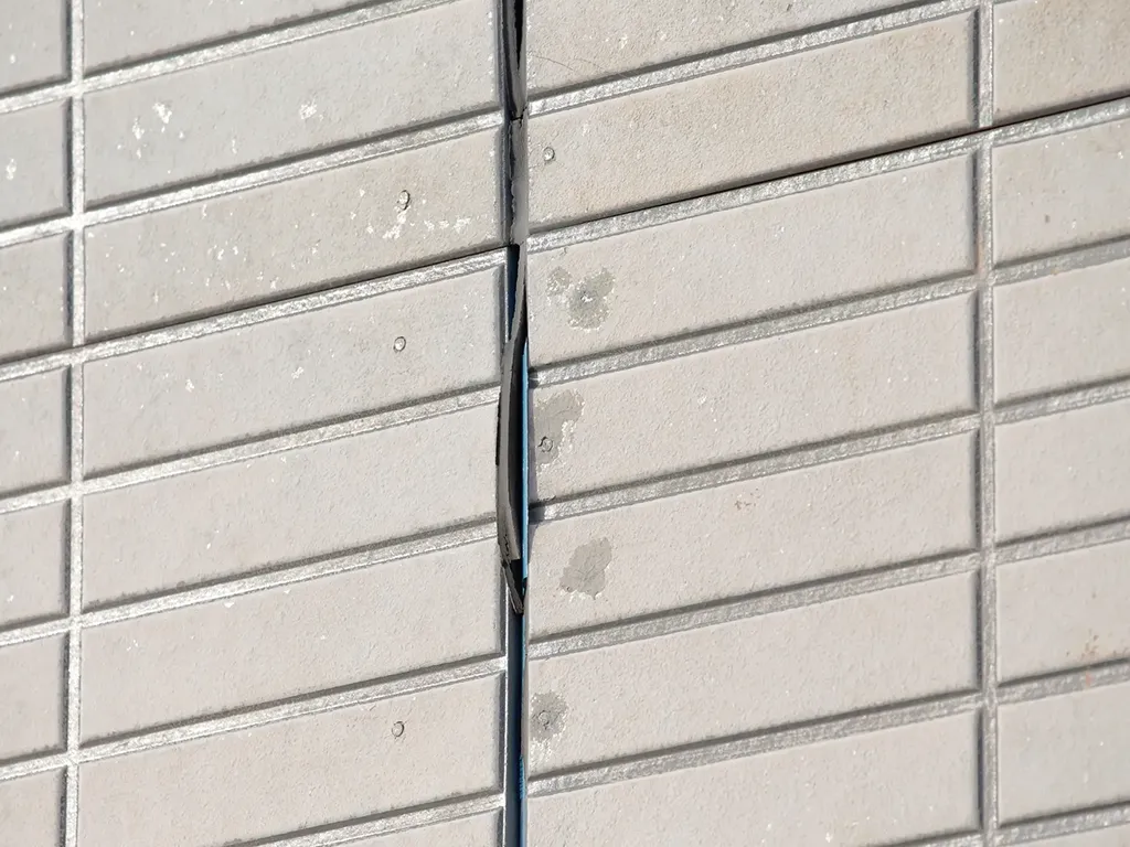 シーリングの破断・大きな隙間 目地が完全に切れて外壁材がむき出し 目地から雨水が侵入し、外壁材の反り・割れを引き起こすため