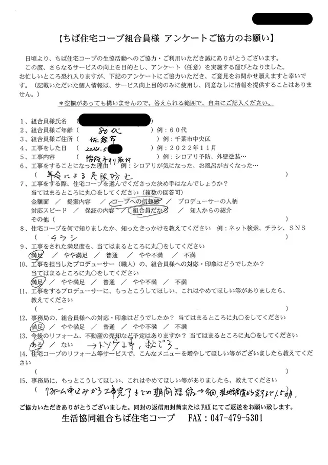 | 事務局への依頼 | リフォーム申込みから工事完了までの期間短縮→今回、現地調査から完了まで1.5カ月 |