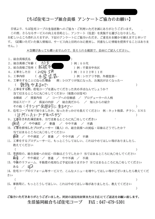 提案内容 コープへの信頼感 プロデューサーの人柄 対応スピード 保証の内容 組合員だから 知人からの紹介 その他 その他を選んだ理由 |