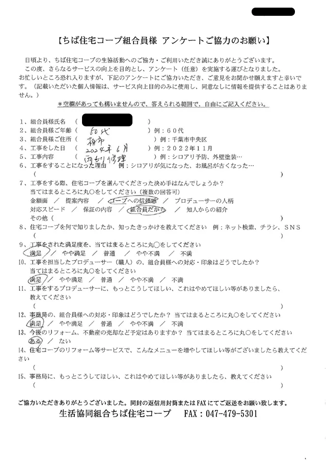 柏市 雨もり修理された組合員アンケート