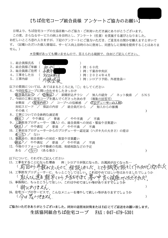 | 工事することになった理由 | 前回から数年がたったので、相談しました。とても誠実に話をして下さったので決めました。 |